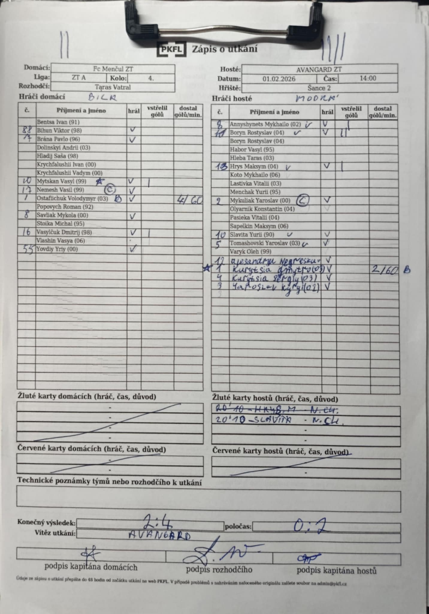 Komentář: Bojovné napínavé utkání vyrovnaných celků.Domácí byli sice více na míči ale proměnit své šance v první čtvrtině hry nedokázali. Hostující Avangard zodpovědně bránil veškeré útoky Menčulu i díky skvělému gólmanovi drželi dlouho čisté konto. Navíc potrestali dvěma góly rozhozenou obranu domácích a tak vedli už o dvě branky.Do přestávky stav se neměnil... Poločas druhý byl jak přes kopírák, neustálý nával útoků na bránu hostů končil buď vedle branky nebo v náručí gólmana hostů.Pro změnu rozhodující smrtící brejky v podání Avangardu přinesli další dvě branky,a stav utkání už byl 1:4 ve prospěch hostů.V poslední minutě ještě domácí vsitili jednu branku ale zlomit utkání ve svůj prospěch už nezbyl čas. Čistá a fér hra obou mužstev.