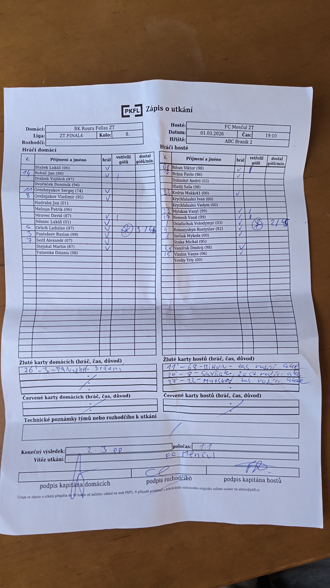 Komentář: Poražení semifinalisté – zápas o 3. místo BK Roura Fellas vs. FC Menčul Utkání nabídlo zajímavý a bojovný fotbal, ve kterém byla vidět technická vyspělost obou týmů i důrazná, avšak férová hra bez zákeřností. V prvním poločase padla po jedné brance na každé straně. K vidění bylo také množství dalších šancí, které však zlikvidovaly pozorné obrany nebo výborně chytající brankáři obou celků. Ve druhé půli se do vedení dostali hráči BK Roura, avšak minutu před koncem základní hrací doby dokázal tým FC Menčul vyrovnat. O vítězi tak muselo rozhodnout prodloužení. V jeho závěru, konkrétně v čase 44:40, vstřelil vítěznou branku FC Menčul hráč s číslem 17 Nemesh, který se stal hrdinou utkání.